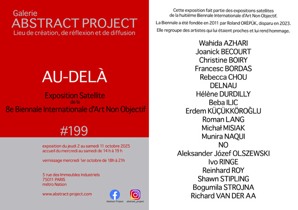 Exposition #199 Exposition du 2 au 11 octobre 2025 Cette exposition fait partie des expositions satellites de la huitième Biennale Internationale d'Art Non Objectif. La Biennale a été fondée en 2011 par Roland ORÉPÜK, disparu en 2023. Elle regroupe des artistes qui lui étaient proches et lui rend hommage.
